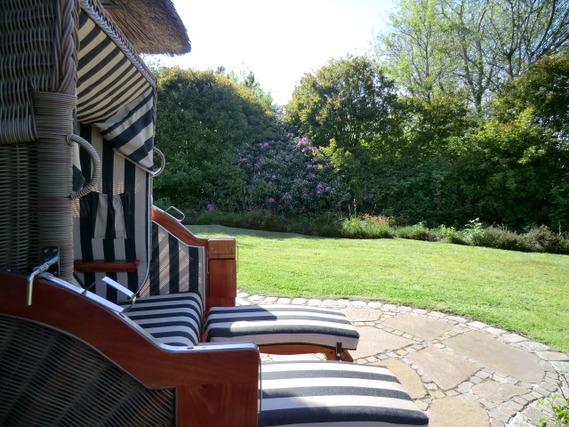 Sehr großer Garten mit 3 Terrassen, hochwertigen Gartenmöbeln, edle grosse Garten-Lounge, Sonnenliegen und Strandkorb.