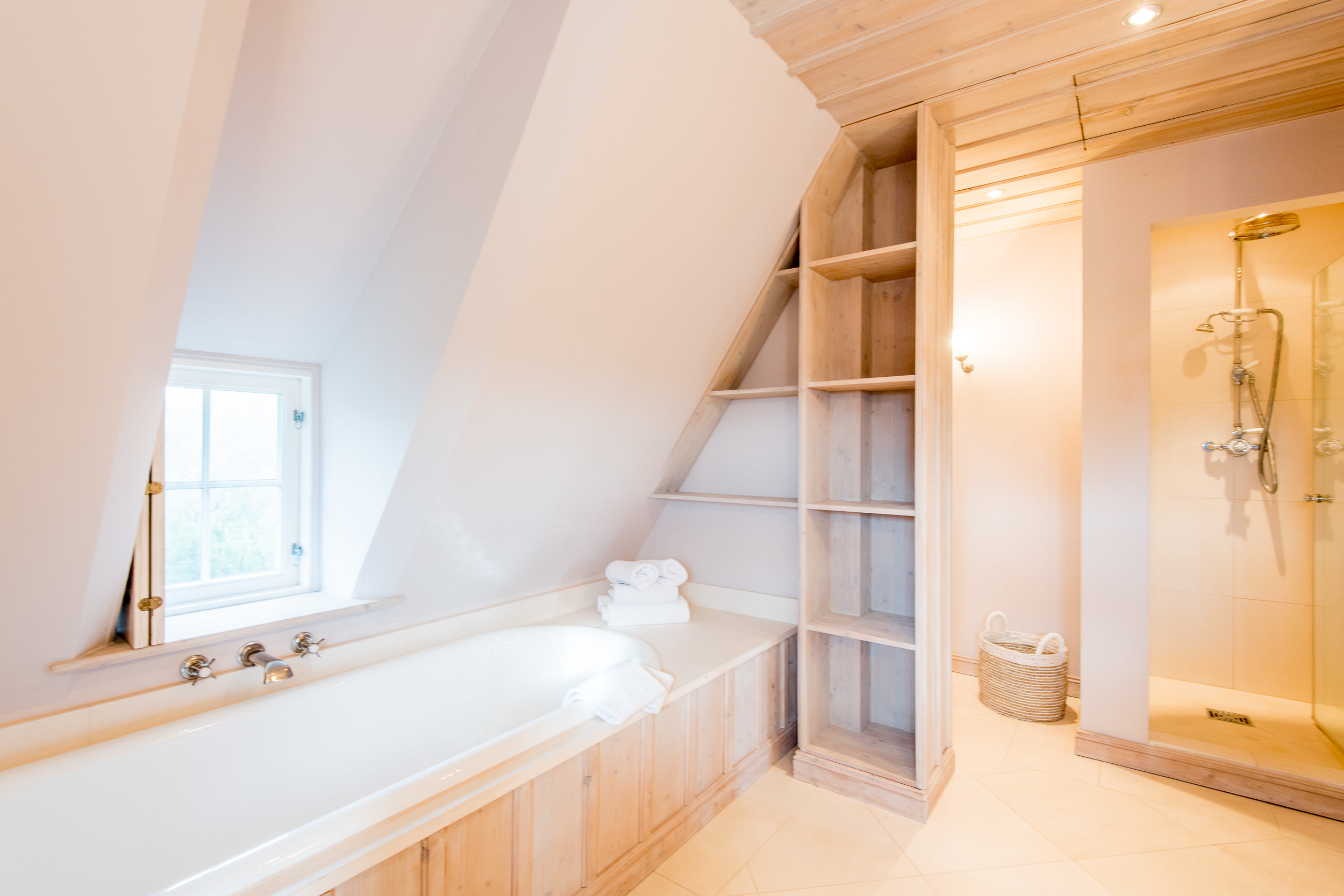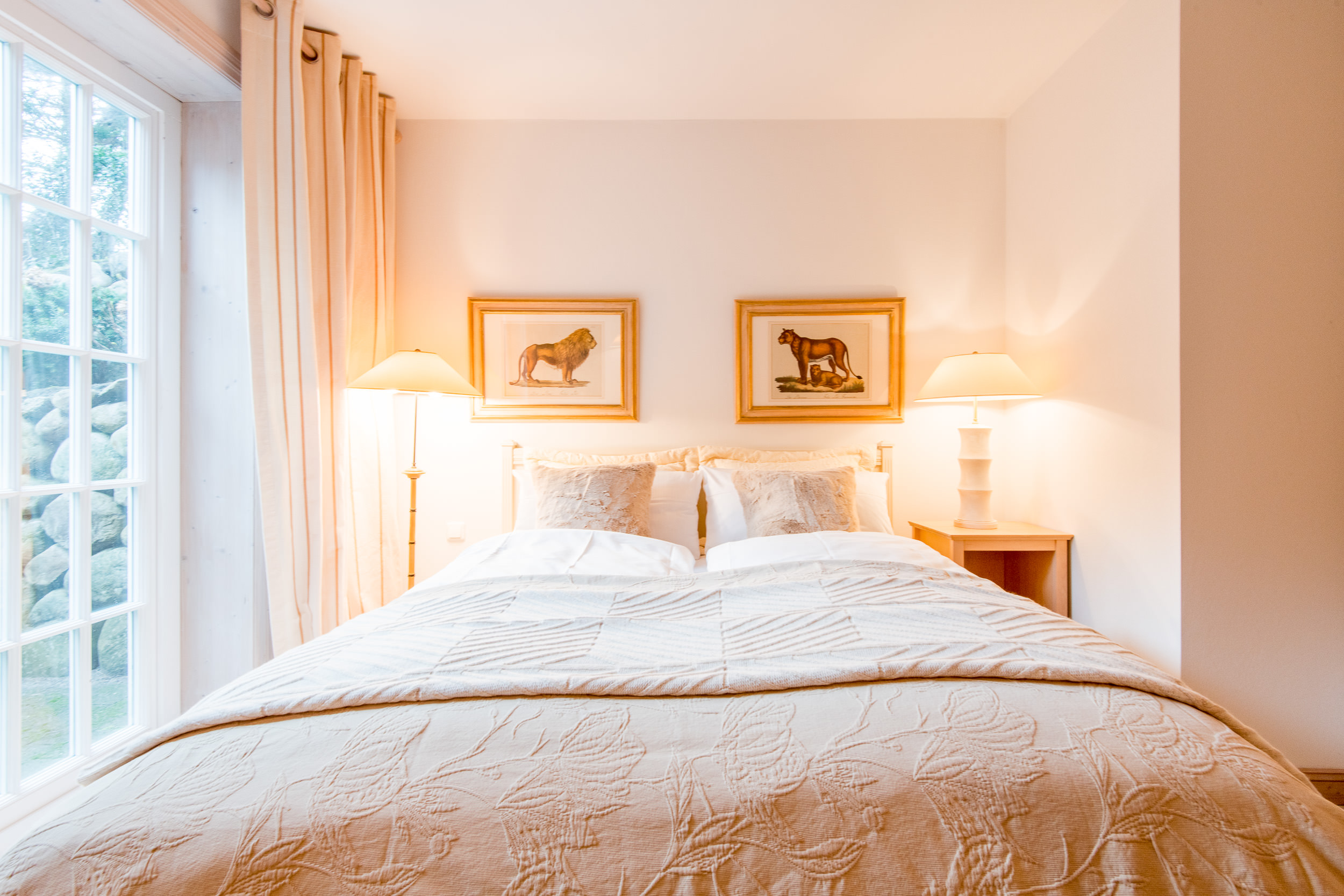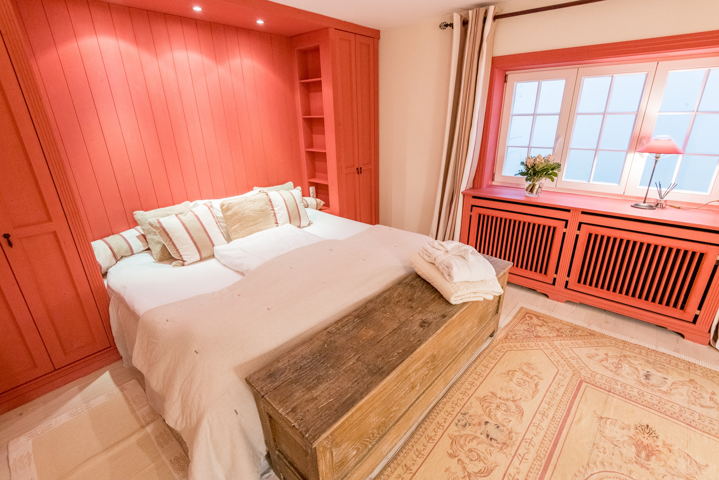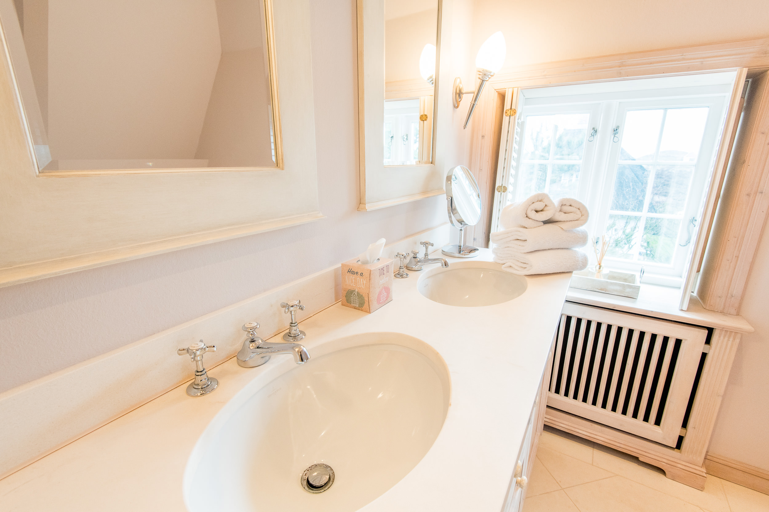 Über eine bequeme Treppe geht es zu den 4 hochwertigen Schlafzimmern, eines davon mit übergroßem King-Size Bett und antikem Schreib-Sekretär im OG mit Blick in den Garten und sehr exklusivem en-Suite Bad mit großer Dusche, 2 Waschbecken, Handtuchheizkörper und großzügiger Wanne mit Blick in den Garten.
