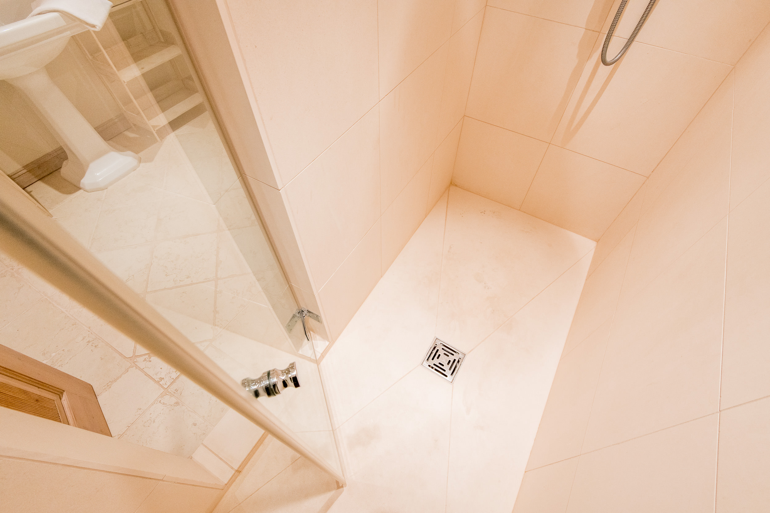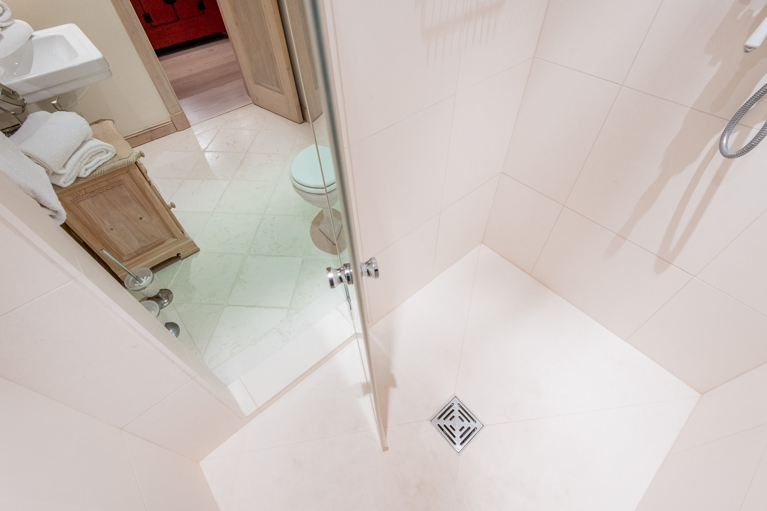 2 weitere edle Badezimmer mit bodentiefen grossen Duschen und exklusiven Ausstattungen, davon eines mit großem Fenster.